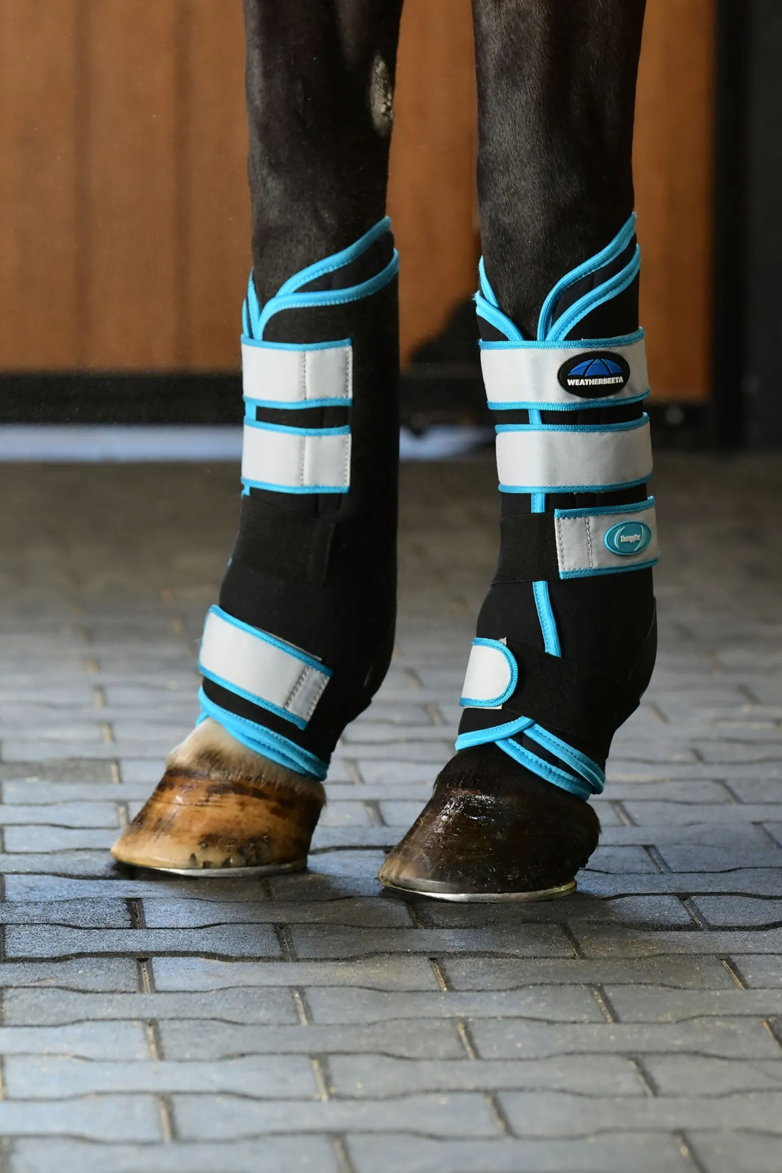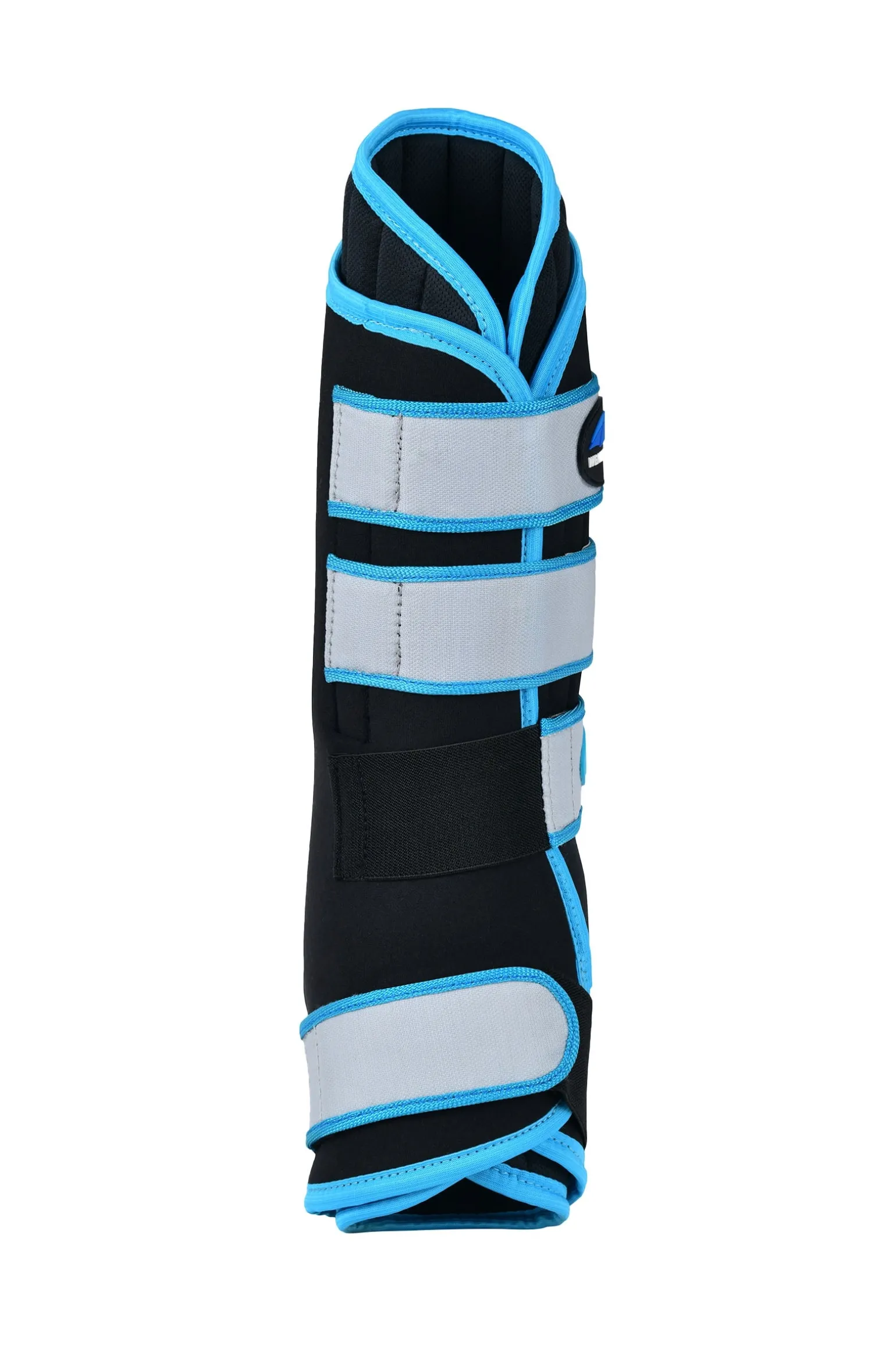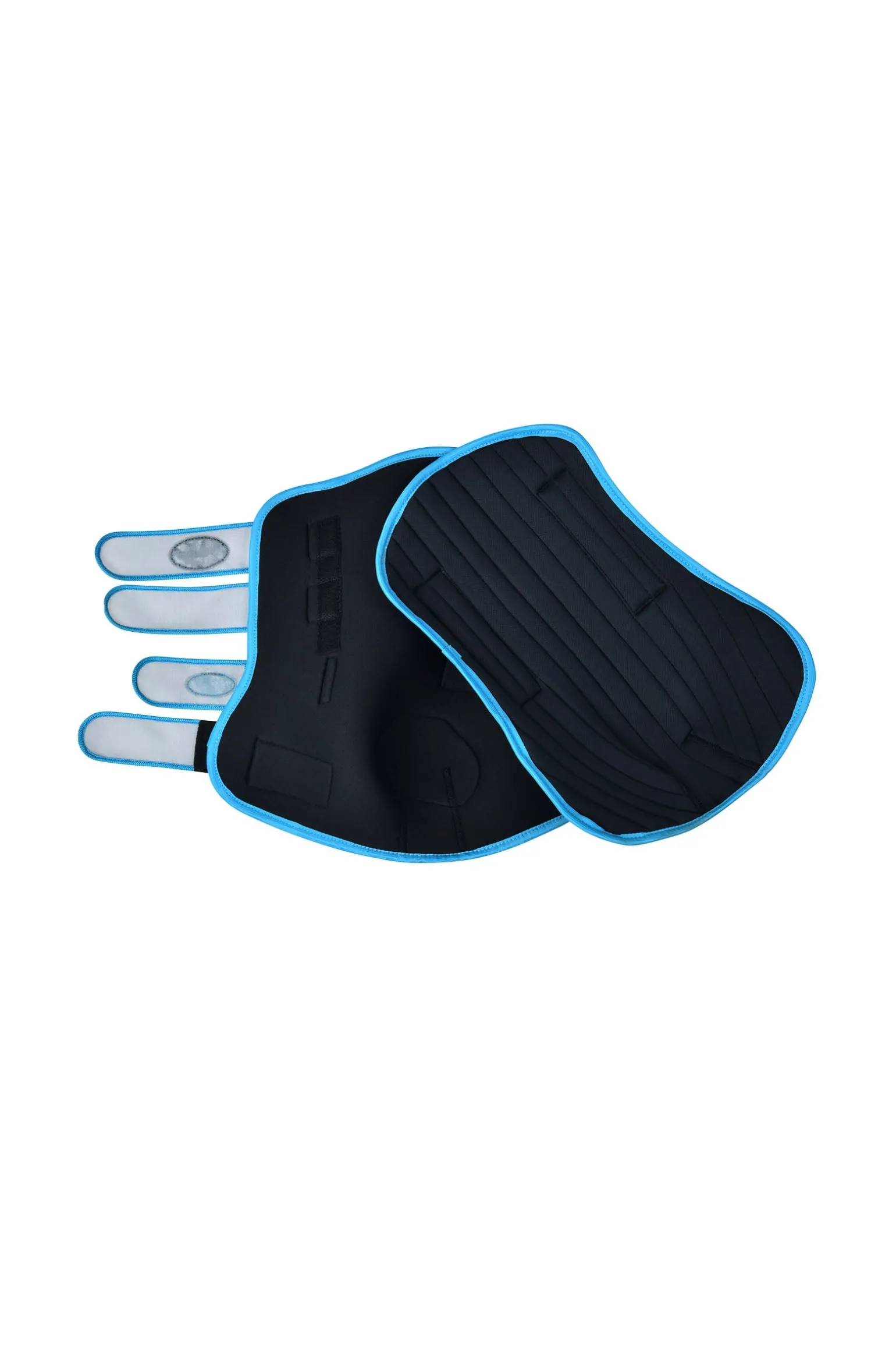 Ideal für Rehabilitation, Erholung und präventive Pflege. Kann während des Reisens und beim Stehen auf Wettbewerben verwendet werden. Einfach zu verwendende Beinschutzbandagen, die aus zwei Teilen bestehen: Das äußere Material besteht aus starkem, haltbarem Neopren mit vier praktischen Klettverschlusslaschen. Im Inneren befindet sich ein weiches, gepolstertes, keramisch infundiertes Pad, das herausnehmbar ist. Zusätzlicher Schutz für die Sprunggelenke. Kann an Vorder- und Hinterbeinen verwendet werden.