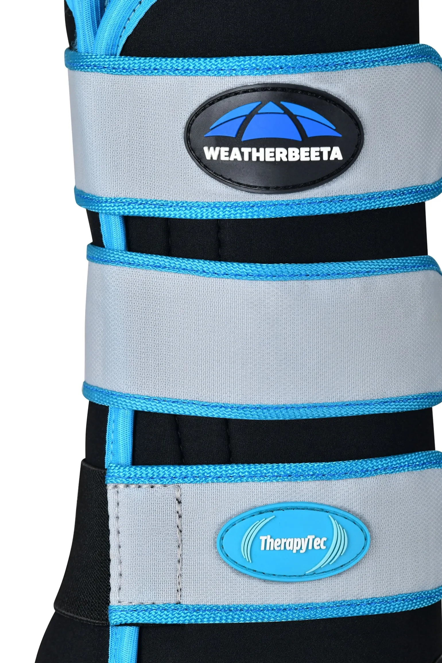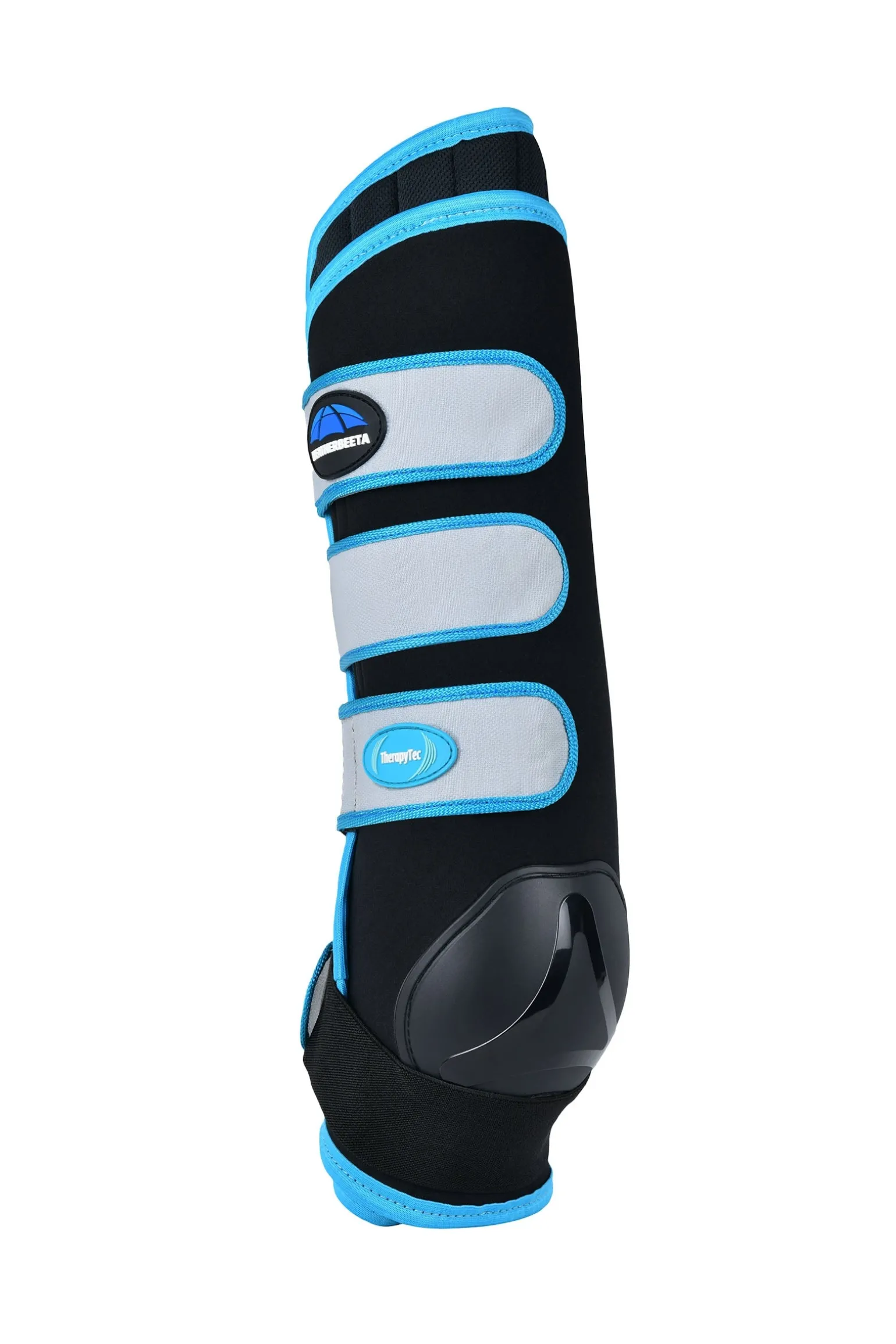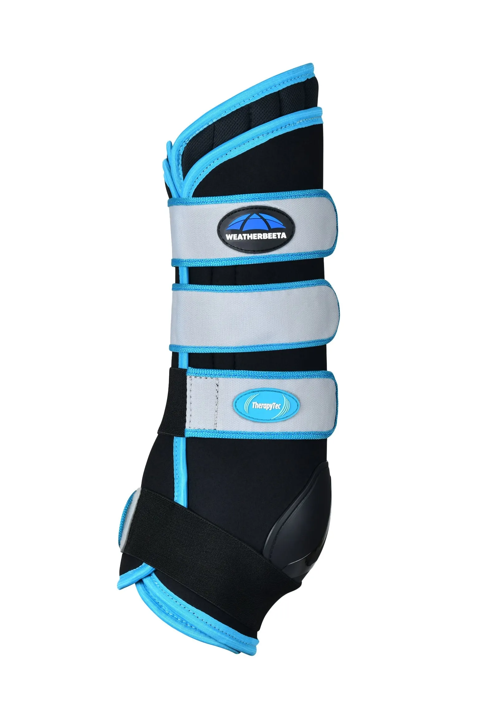 Ideal für Rehabilitation, Erholung und präventive Pflege. Kann während des Reisens und beim Stehen auf Wettbewerben verwendet werden. Einfach zu verwendende Beinschutzbandagen, die aus zwei Teilen bestehen: Das äußere Material besteht aus starkem, haltbarem Neopren mit vier praktischen Klettverschlusslaschen. Im Inneren befindet sich ein weiches, gepolstertes, keramisch infundiertes Pad, das herausnehmbar ist. Zusätzlicher Schutz für die Sprunggelenke. Kann an Vorder- und Hinterbeinen verwendet werden.