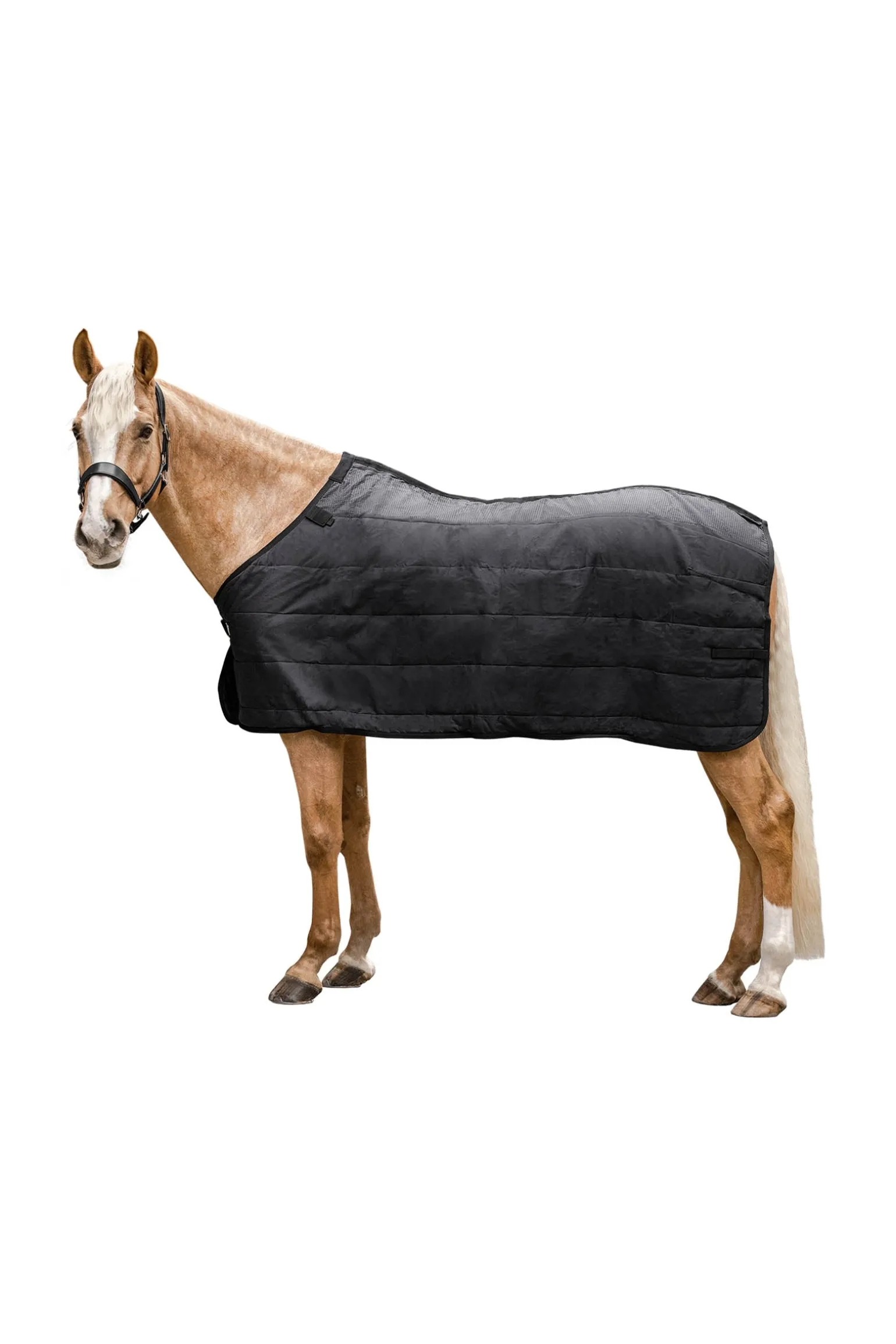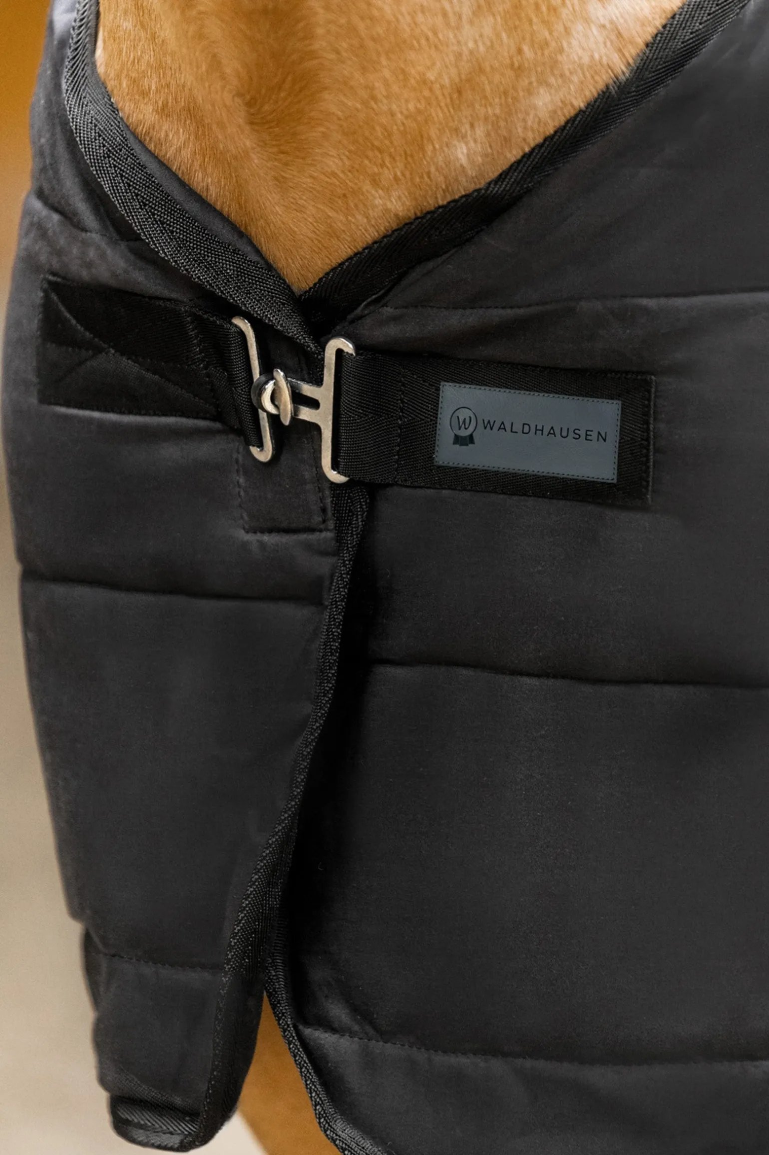 Warming, breathable underrug with 200 g/m² thermofill. The outer material has a silicone print in the back area which helps prevent the rug on top from slipping. Simple T-chest fastening with elastic and touch tape cover. 2 elastic touch tape straps in both the shoulder area and hind end for easy attachment to all Waldhausen turnout rugs