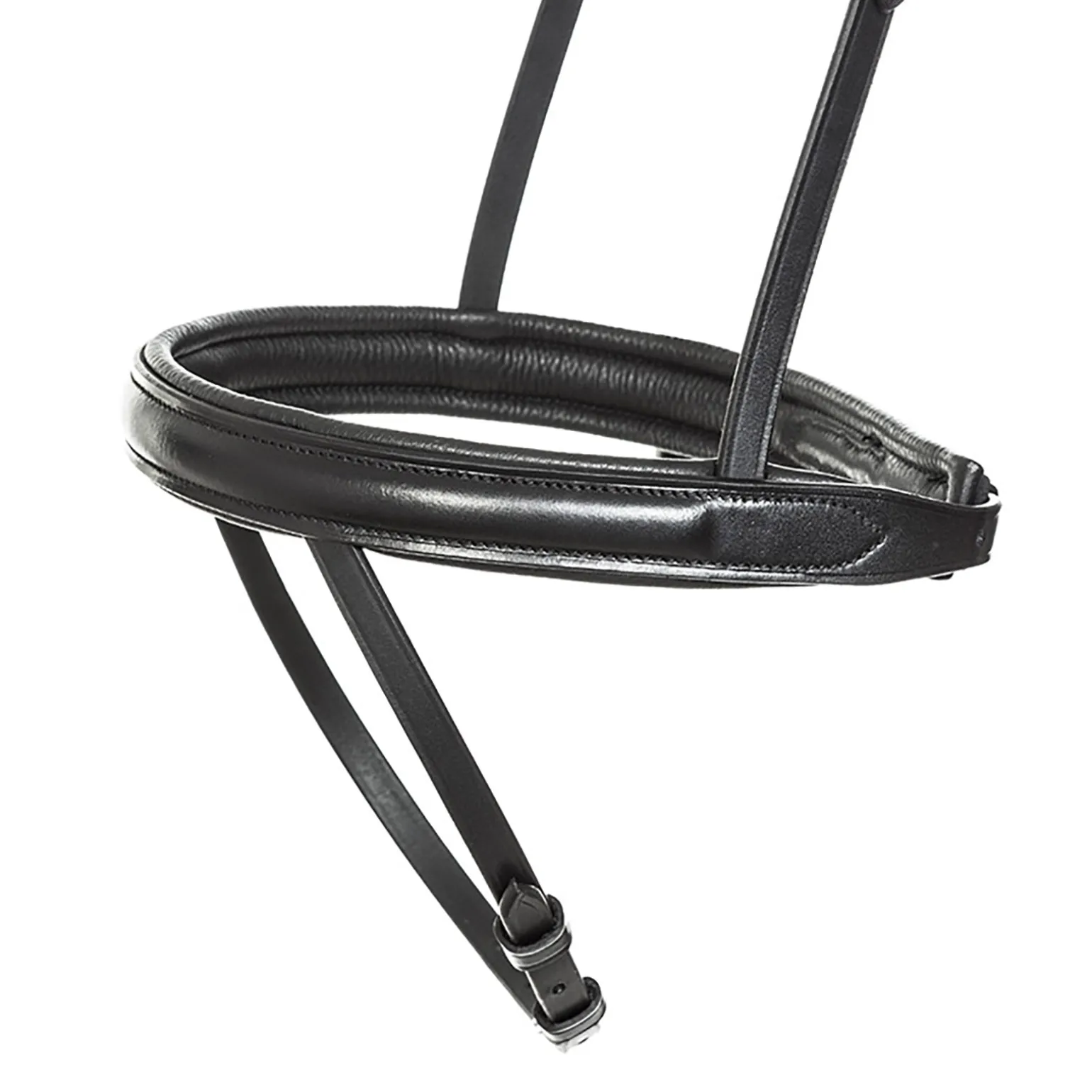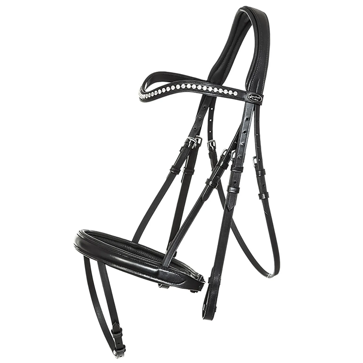 Englisches Reithalfter, fest vernäht. Kopfstück und Reithalfter gepolstert. Spezieller Sperrriemen, an den Seiten der Nüstern befestigt, gewährleistet besondere Freiheit der Atemwege. Extra breites gebogenes Genickstück mit Ohrenfreiheit. Gebogenes Strassstirnband. Mit gummierten Zügeln mit Stegen.