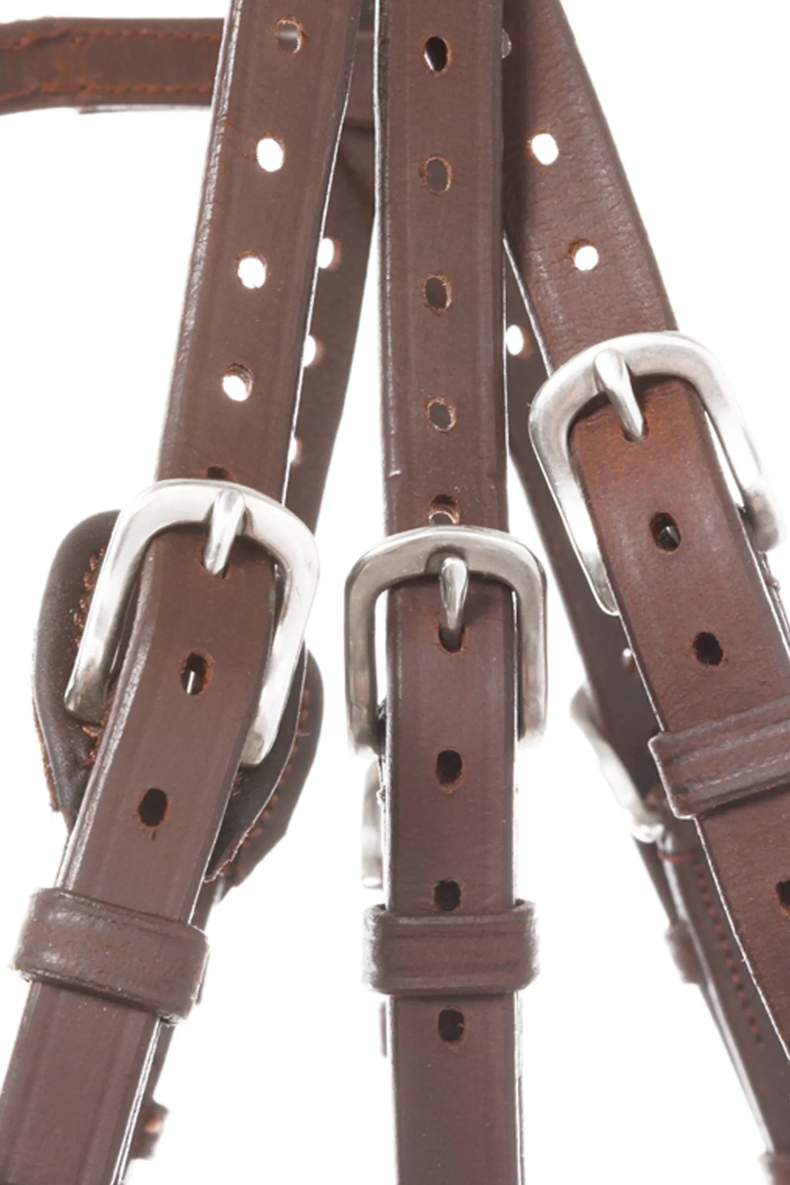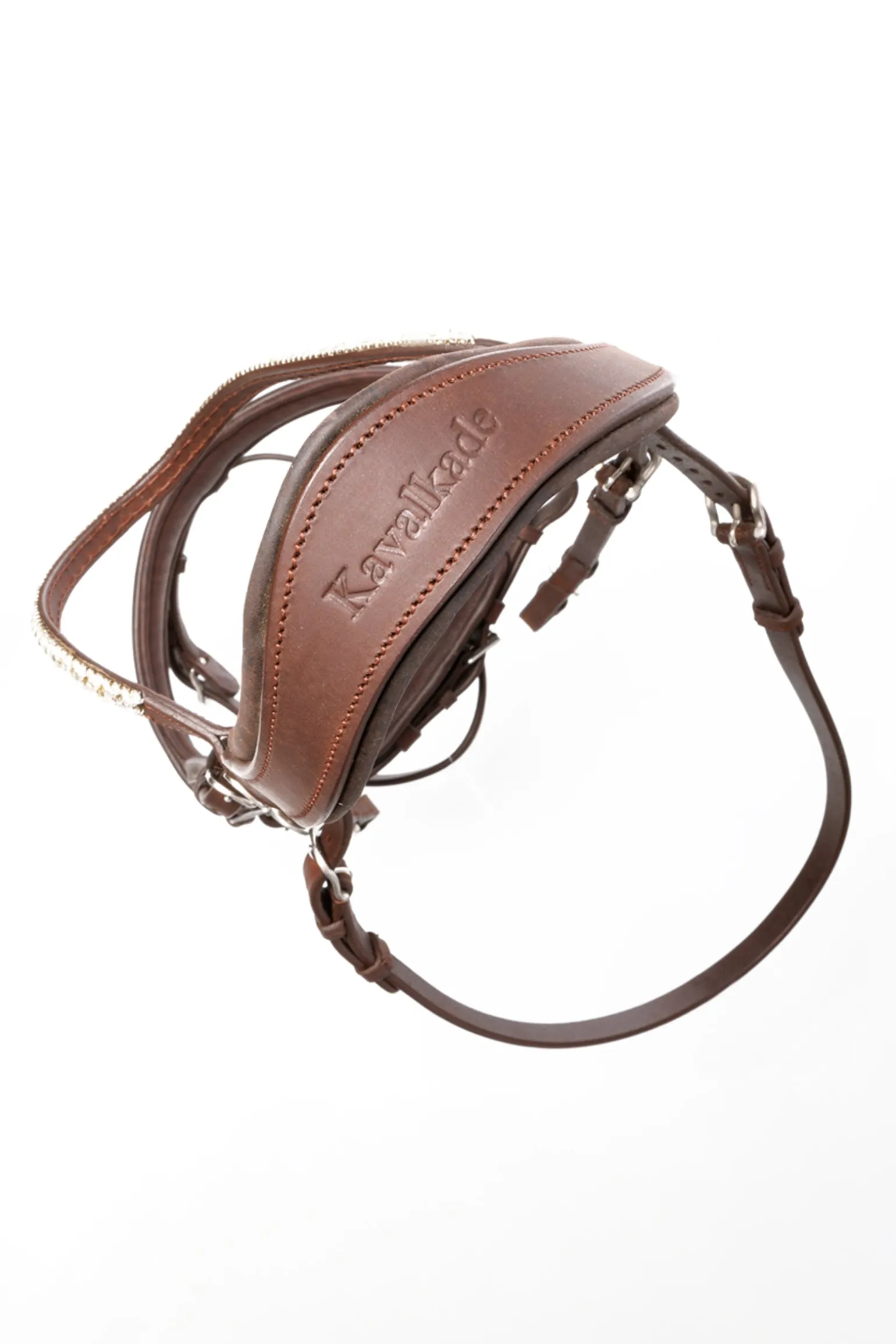 Geschmeidig, langlebig und klassisch – Trense Everlyn KavalSH4. Die Trense besteht aus erstklassigem, geöltem Leder und verfügt über ein anatomisch geformtes, sehr weich gepolstertes Genickstück mit großem Ohrenausschnitt, der die Nerven entlastet und den Ohren mehr Bewegungsfreiheit bietet. Die weiche Polsterung des Nasenriemens und Stirnriemens sorgt ebenfalls für besonderen Komfort für das Pferd. Der schräg verlaufende Kehlriemen sorgt dafür, dass er glatt anliegt und nicht nach vorne hängt. Die größeren Schnallen und ovalen Löcher ermöglichen ein einfaches Schließen. Das Stirnband funkelt mit großen und kleinen weißen Strasssteinen. Der Nasenriemen ist beidseitig verstellbar. Inklusive gummierter Zügel mit Stoppern (16 mm). KavalSH4 – abnehmbarer Sperrriemen ohne sichtbare Befestigung. Trensen mit der Bezeichnung „KavalSH4“ sind Trensen, bei denen der Sperrriemen entfernt werden kann. Das Besondere daran ist, dass die Befestigung des Sperrriemens nicht sichtbar ist, wie bei herkömmlichen Trensen mit abnehmbarem Sperrriemen. Das geölte Leder der Trense Everlyn ist pflanzlich gegerbt und hat seine natürliche Narbung. Während des Gerbprozesses werden hochwertiges, nicht emulgiertes Öl und Penetrationsmittel hinzugefügt, damit die Lederfasern geschmeidig sowie wasser- und schmutzabweisend werden. Dieser Prozess macht das Leder weich, langlebig und pflegeleicht.
