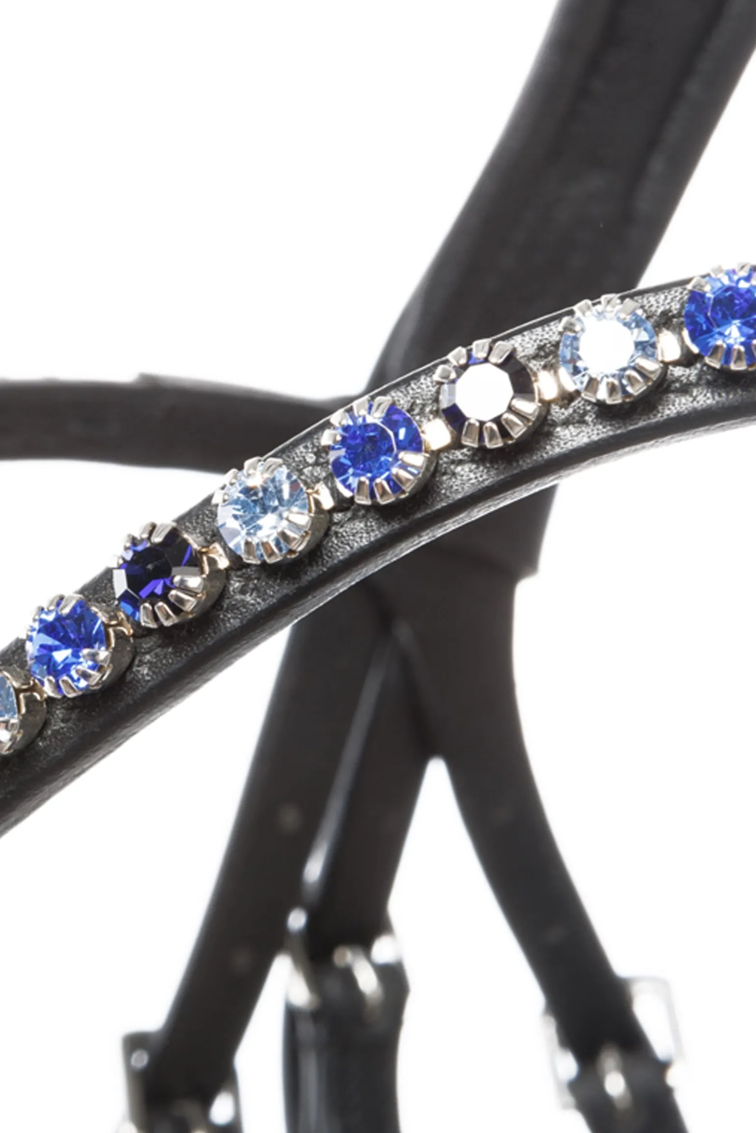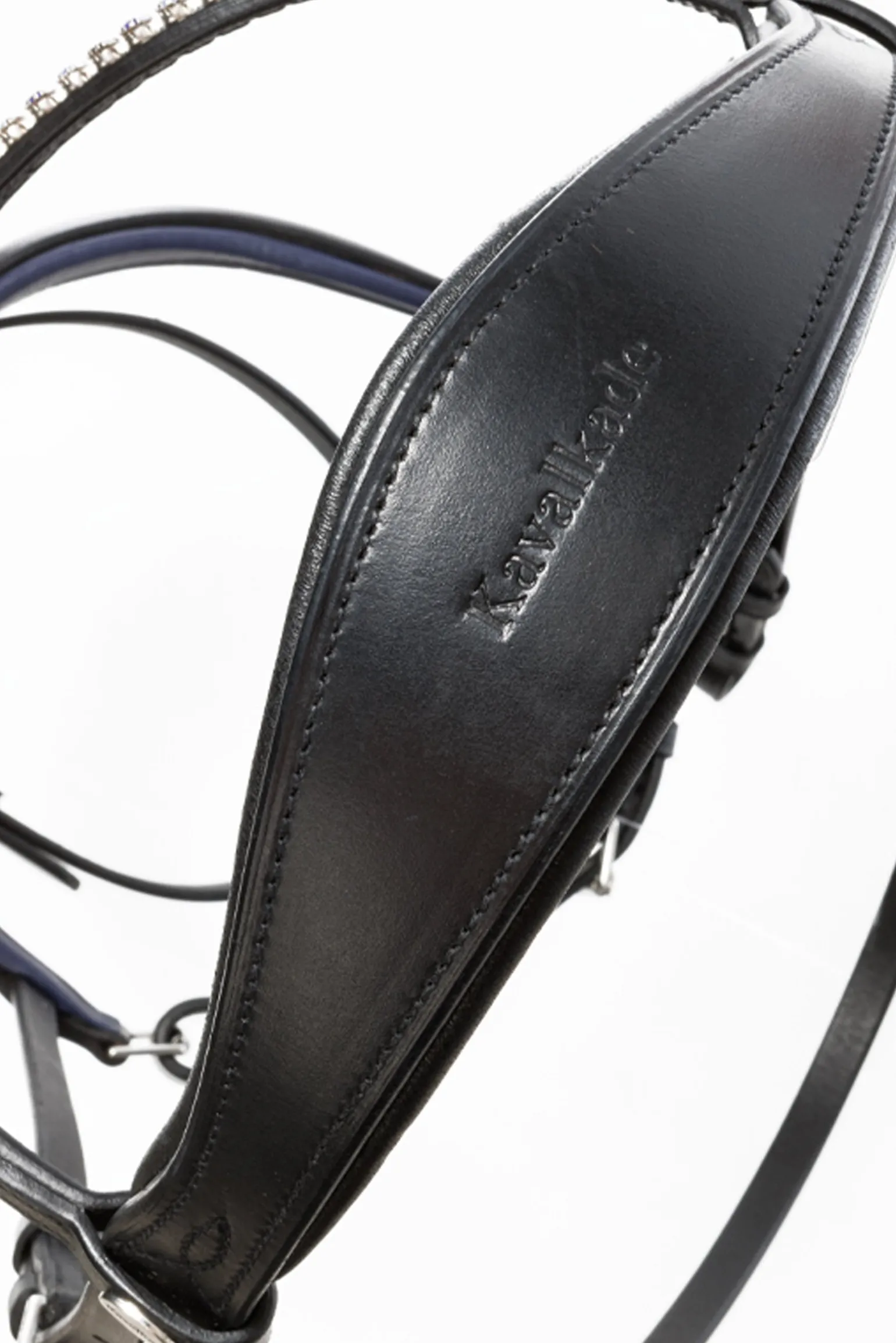 Die modische Trense „Ocean“ KavalSH4 mit dunkelblau unterlegtem Nasenriemen und funkelnden blauen Strasssteinen auf dem Stirnriemen besteht aus hochwertigem Leder und ist beidseitig verstellbar für eine optimale Passform. Das Genickstück ist anatomisch geformt und extra breit für mehr Ohrenfreiheit. Der Nasenriemen ist weich gepolstert und anatomisch geschnitten. Gummierte Zügel mit Stoppern (16 mm). Passende Sporenriemen. KavalSH4 – abnehmbarer Sperrriemen ohne sichtbare Befestigung. Trensen mit der Bezeichnung „KavalSH4“ sind Trensen, bei denen der Sperrriemen entfernt werden kann. Das Besondere daran ist, dass die Befestigung des Sperrriemens nicht sichtbar ist, wie bei herkömmlichen Trensen mit abnehmbarem Sperrriemen.