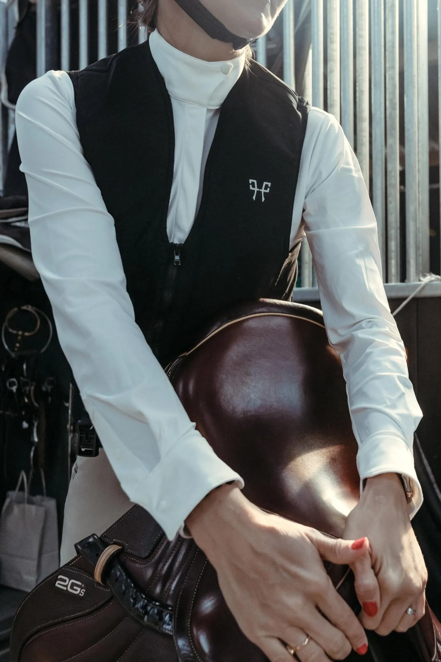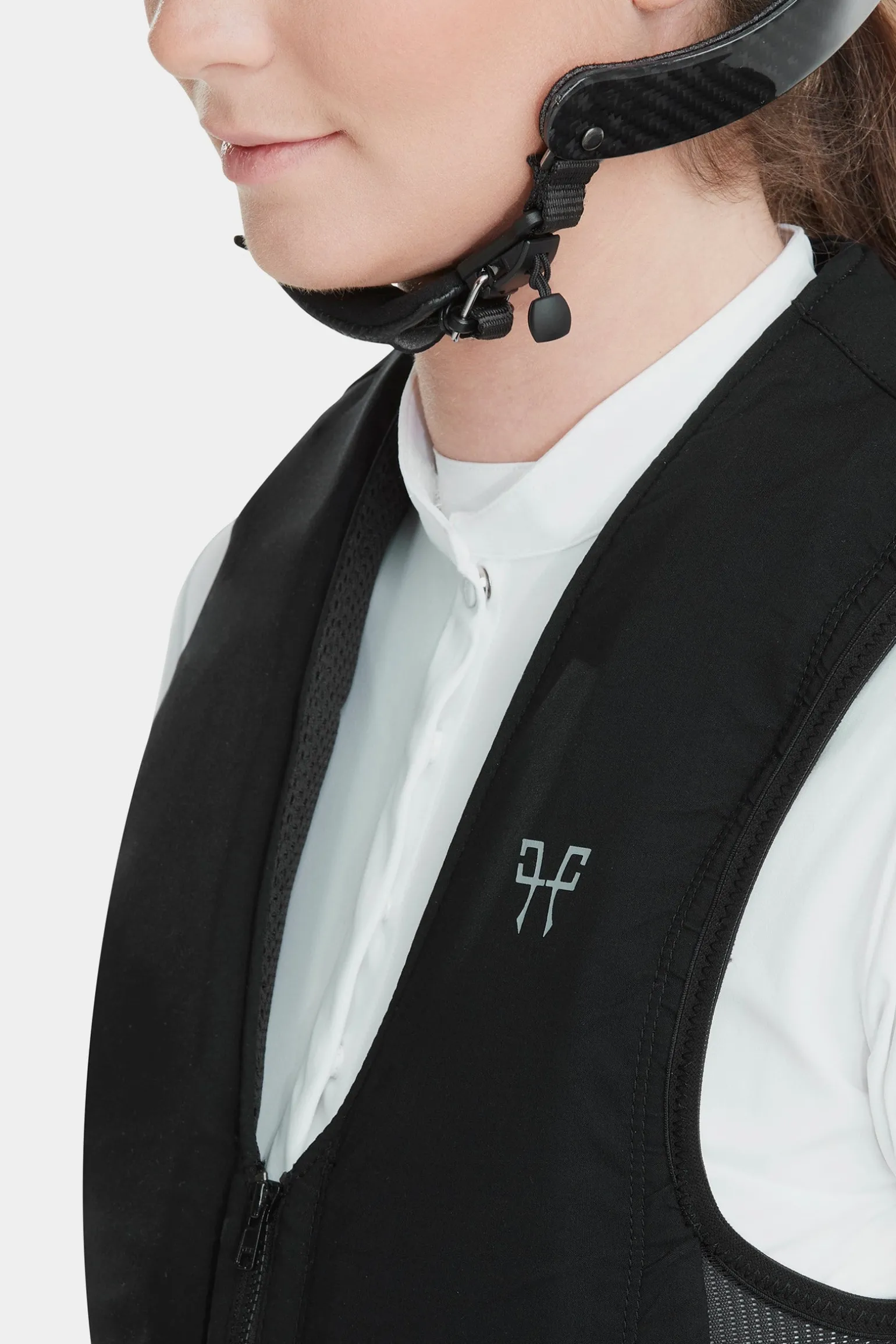 Eine Reitschutzweste mit Airbag, hergestellt in Frankreich und zertifiziert nach der neuen NF S72-800:2022-Norm, die Schutz, Komfort und Diskretion garantiert. Der Airbag wird mit einer Leine und einer Gaskartusche geliefert.