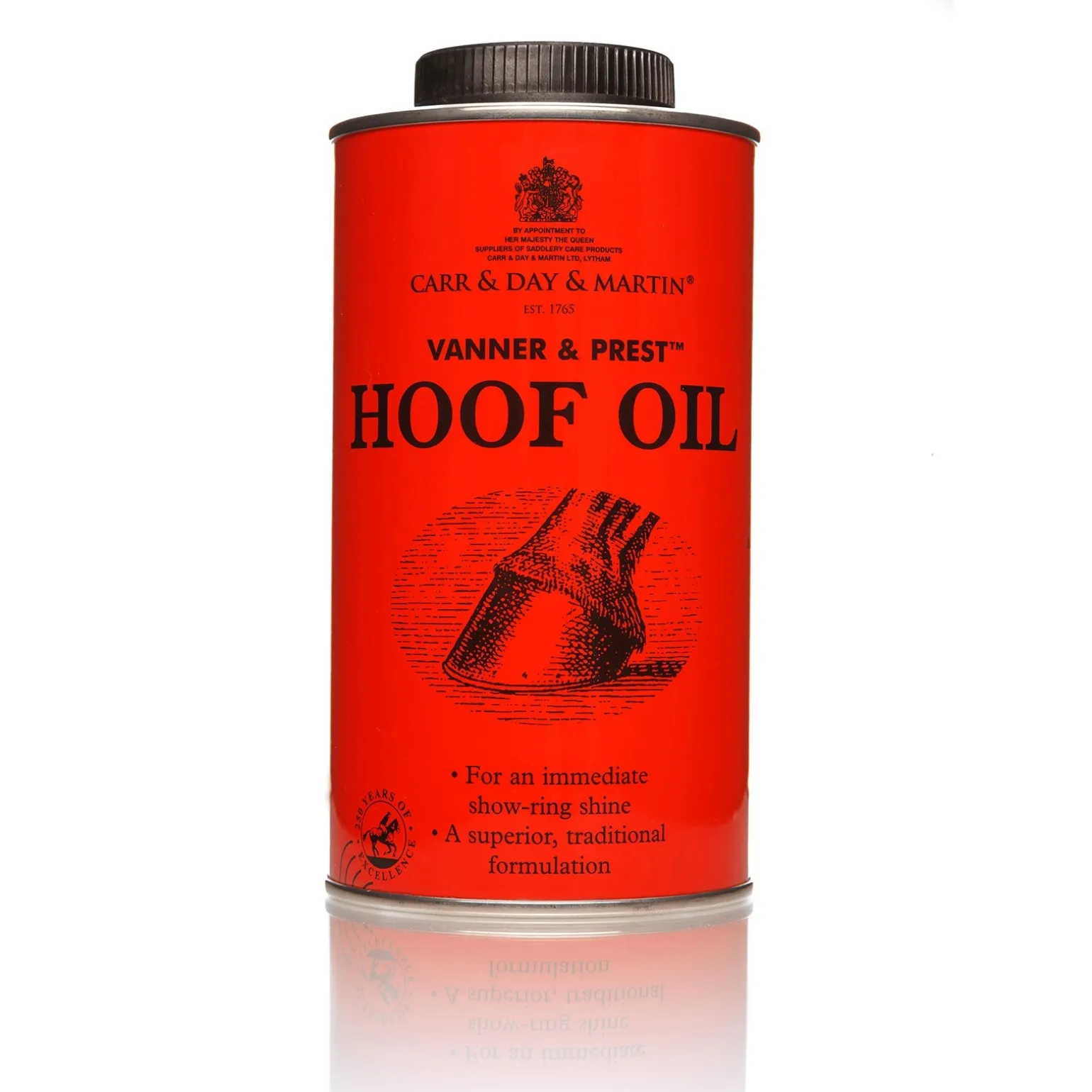 Carr Day Martin Vanner & Prest Hoof Oil. A traditional formulation combining pine tar oil with mineral oil to provide mild antibacterial properties, with a distinctive aroma. Great for giving a traditional shine while maintaining healthy hooves.