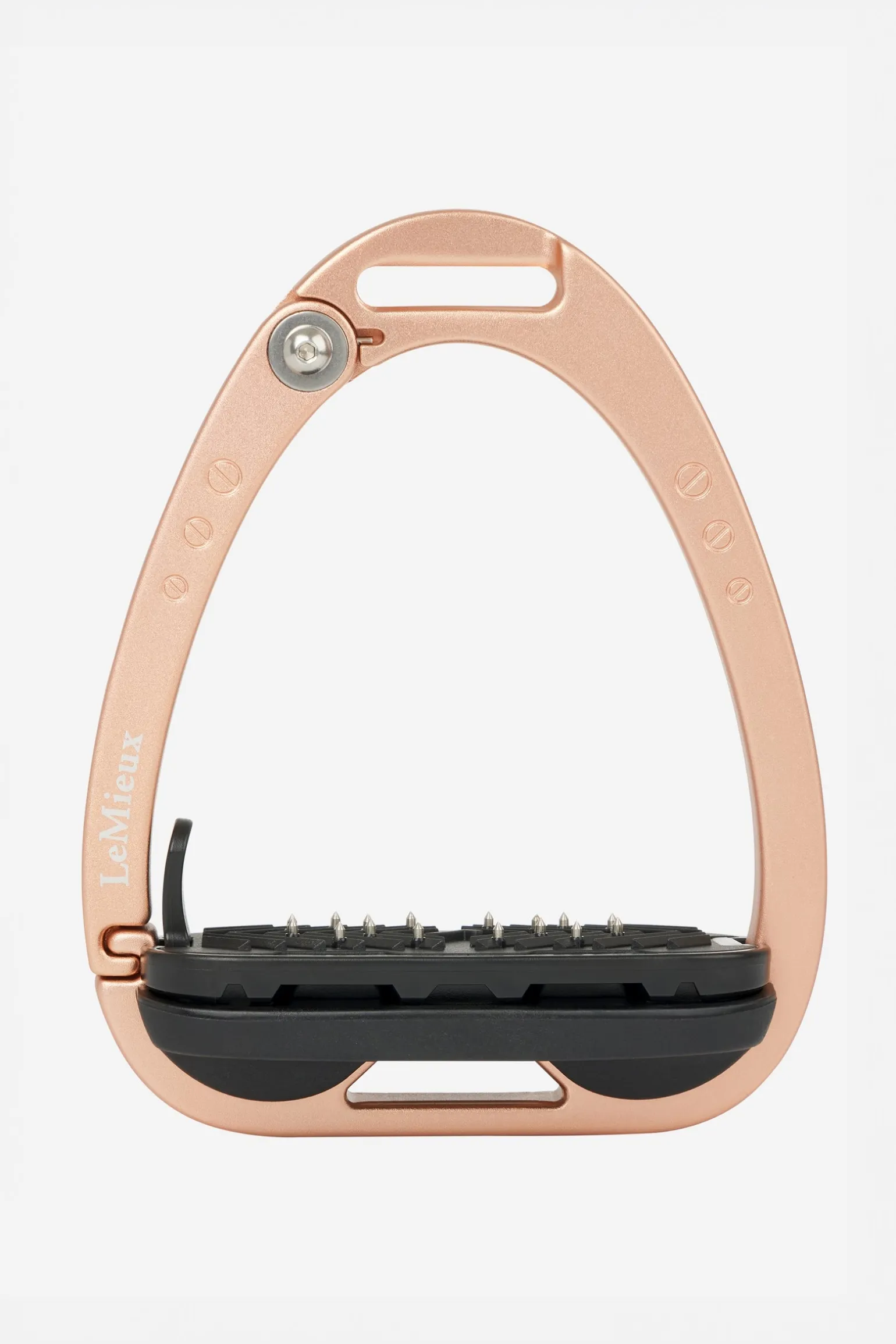 Die Trittfläche wird durch ein Twin-Balance-Bogensystem gestützt, das das Gewicht gleichmäßig auf die Basis des Steigbügelrahmens verteilt. Der Scheitelpunkt des Rahmens ist vertieft und versetzt, was eine 45º-Ausrichtung nach außen fördert und es dem Reiter erleichtert, den optimalen Winkel für den Fuß zu finden und einen verlorenen Steigbügel wiederzufinden.