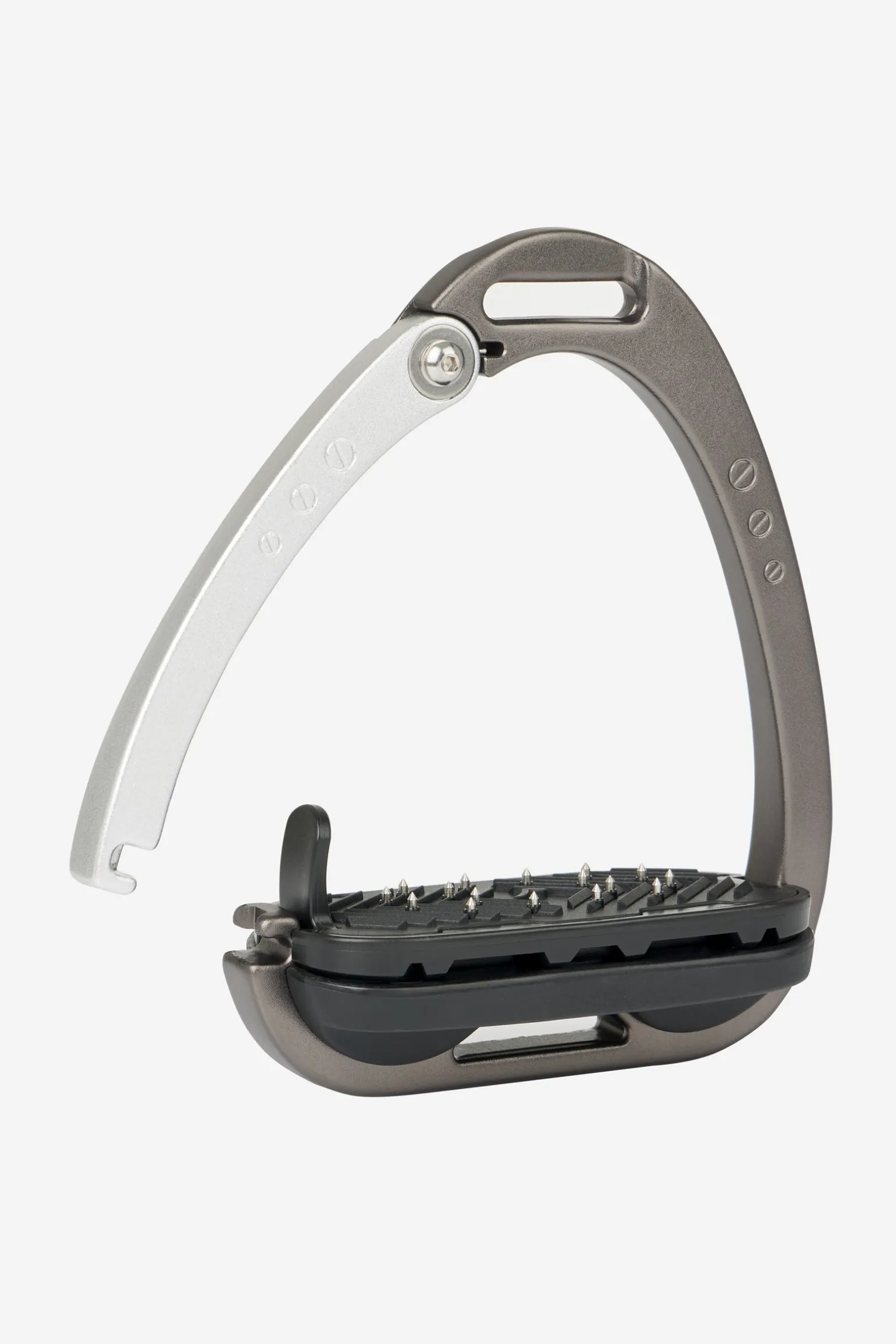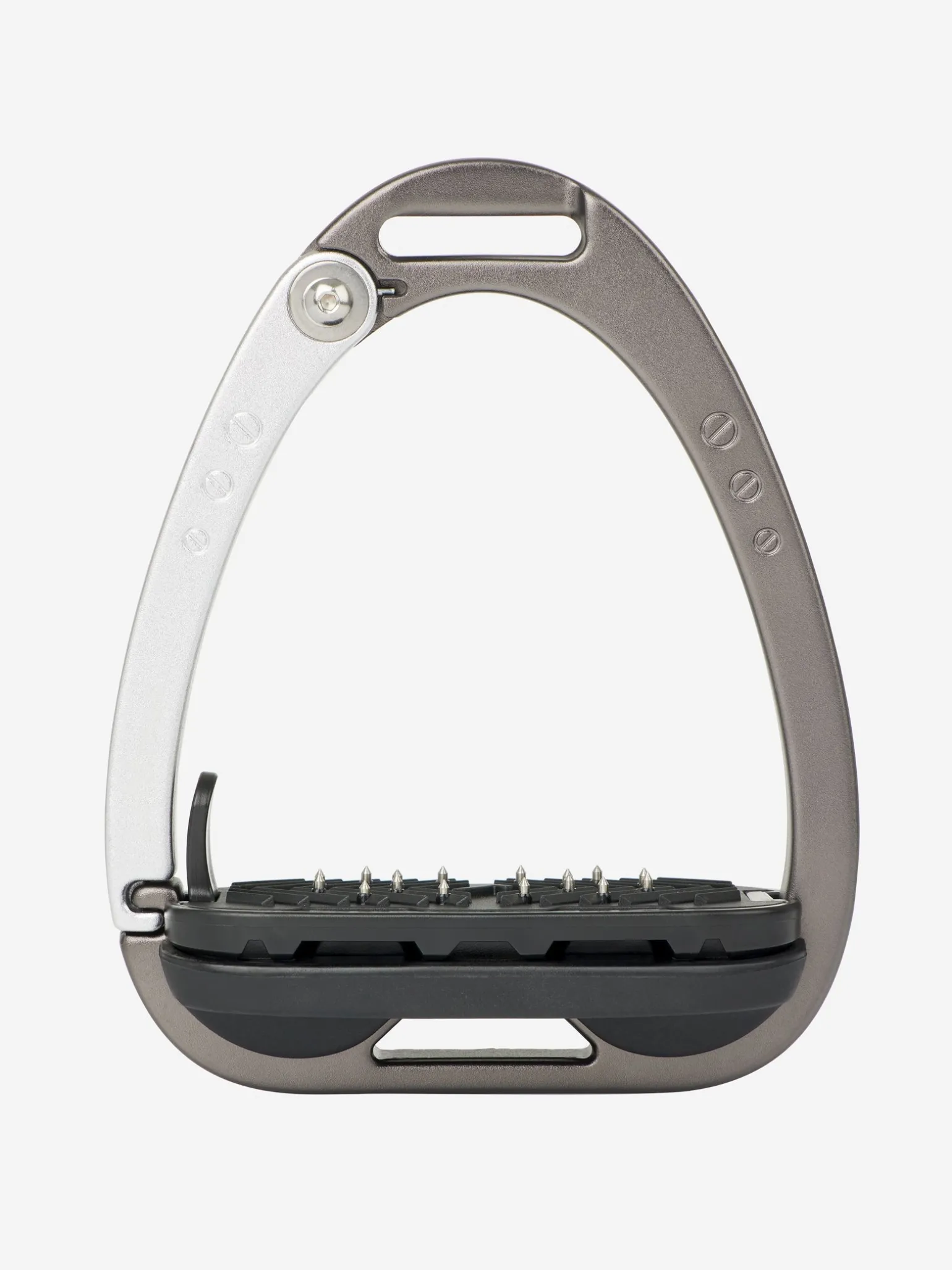 Die Trittfläche wird durch ein Twin-Balance-Bogensystem gestützt, das das Gewicht gleichmäßig auf die Basis des Steigbügelrahmens verteilt. Der Scheitelpunkt des Rahmens ist vertieft und versetzt, was eine 45º-Ausrichtung nach außen fördert und es dem Reiter erleichtert, den optimalen Winkel für den Fuß zu finden und einen verlorenen Steigbügel wiederzufinden.