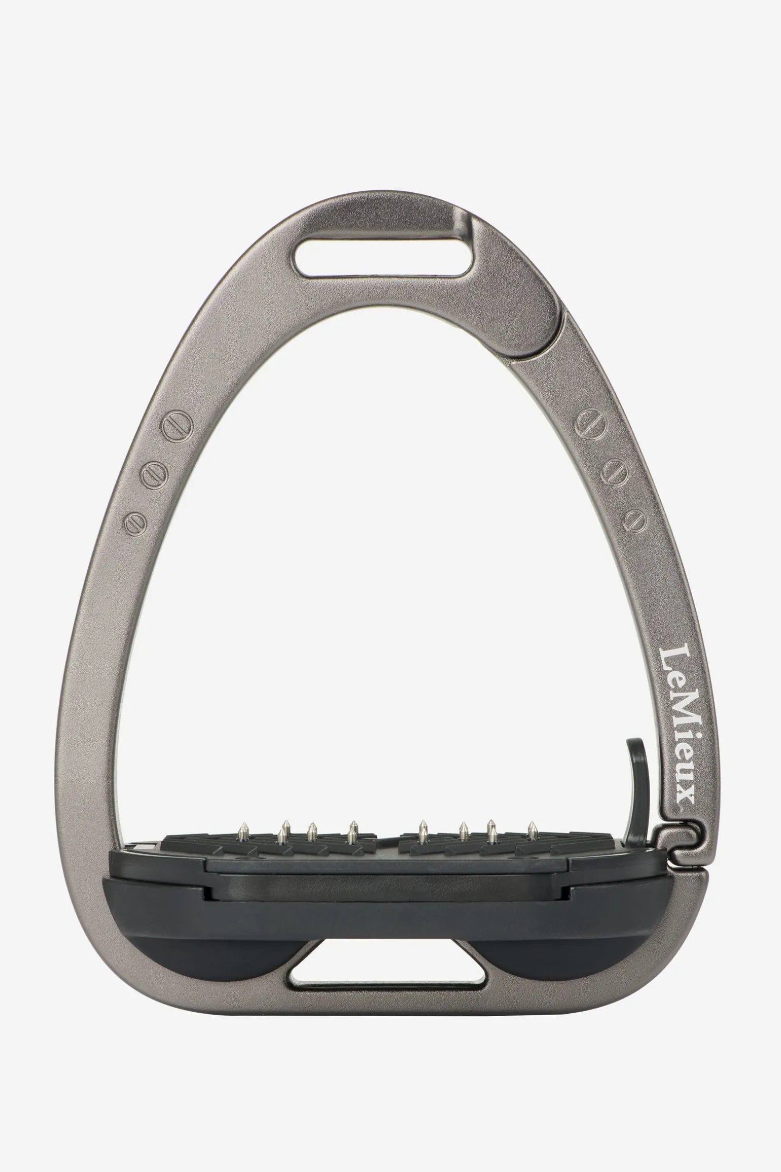 Die Trittfläche wird durch ein Twin-Balance-Bogensystem gestützt, das das Gewicht gleichmäßig auf die Basis des Steigbügelrahmens verteilt. Der Scheitelpunkt des Rahmens ist vertieft und versetzt, was eine 45º-Ausrichtung nach außen begünstigt, was es dem Reiter erleichtert, den optimalen Winkel für den Fuß zu finden und einen verlorenen Steigbügel wiederzufinden.