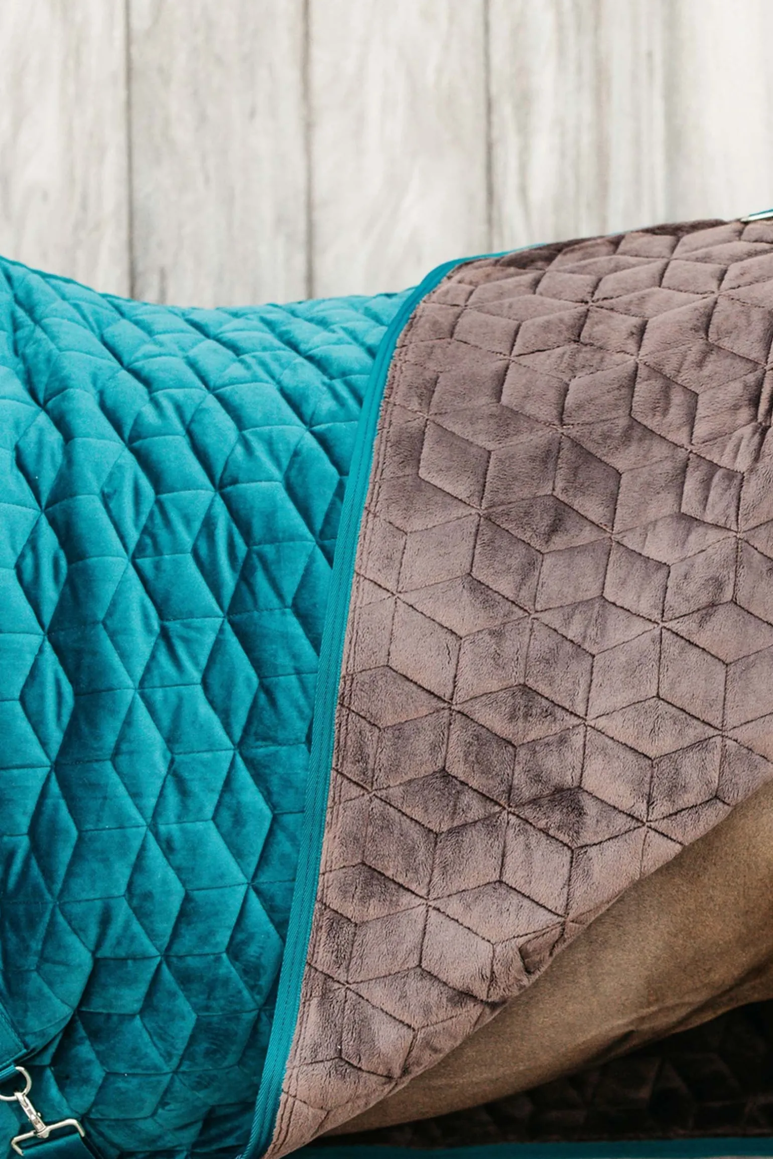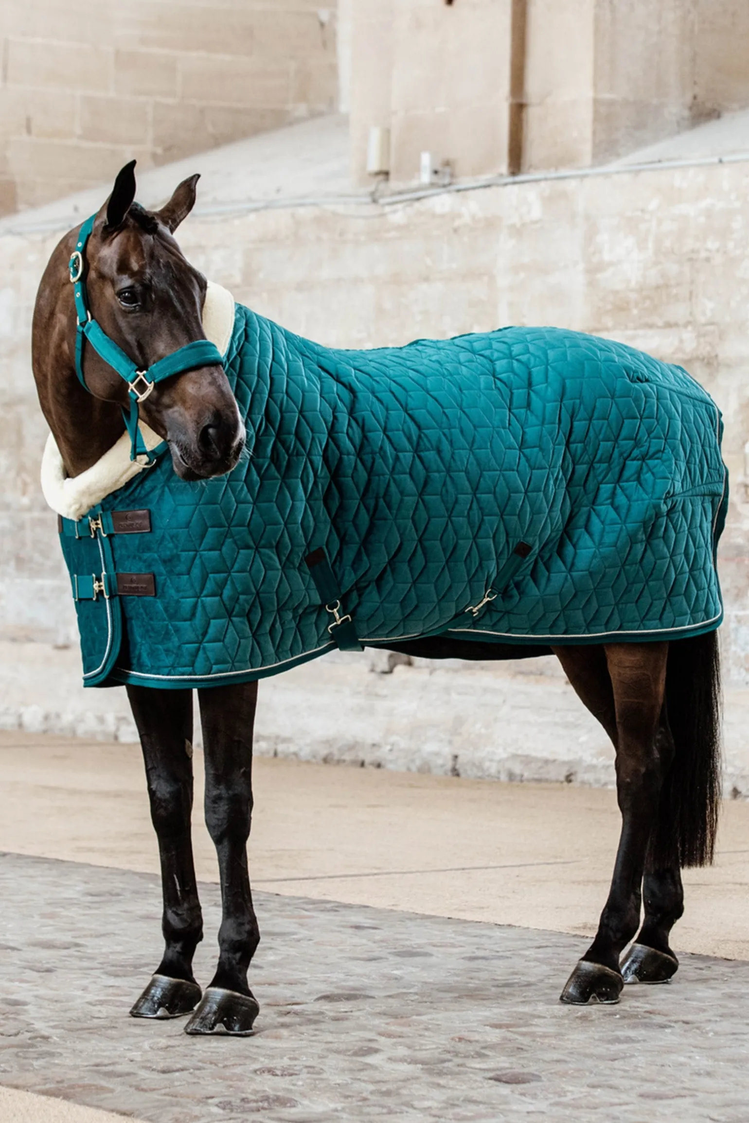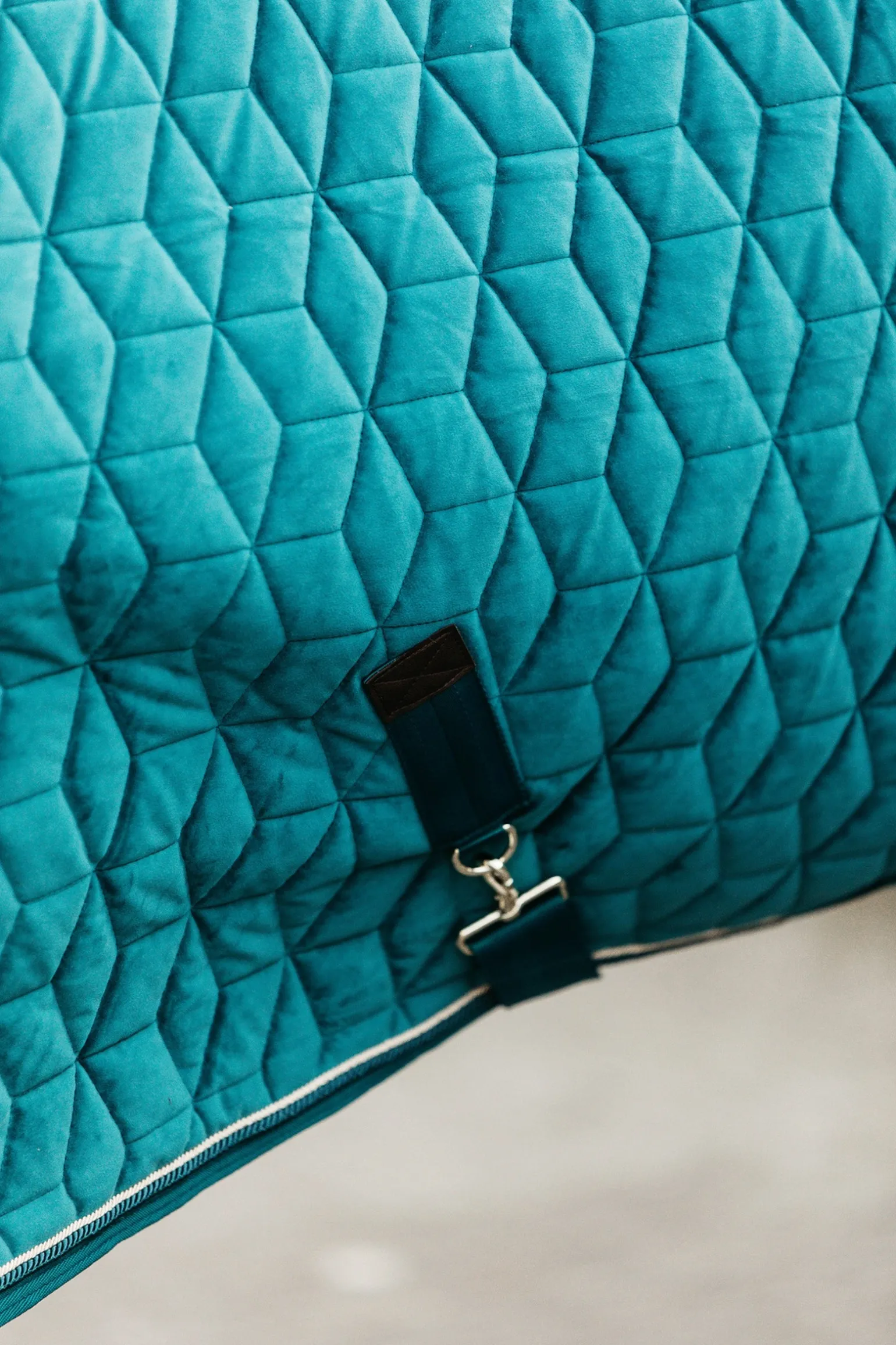 Mit der Turnierdecke Velvet wirst du im Stall sicher auffallen. Die Decke ist mit 160g gefüllt und eignet sich im Winter perfekt als Stalldecke zu Hause oder beim Turnier. Die Außenseite der Decke ist aus einem weichen und schicken Samtstoff und einer raffinierten Steppschicht. Die Würfel-gesteppte Schicht macht es Pferden schwer, die Decke zu zerbeißen. Die Innenseite der Decke ist mit künstlichem Kaninchenfell ausgekleidet, das Scheuern verhindert. Das künstliche Kaninchenfell erzeugt auch winzige Lufteinschlüsse, die eine Isolierschicht um dein Pferd bilden und es extra warm halten.