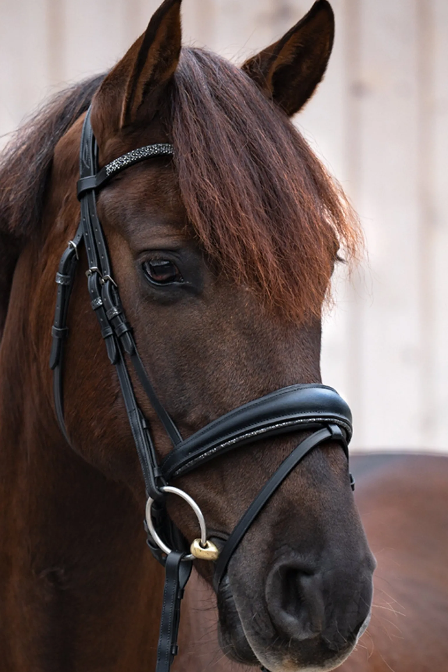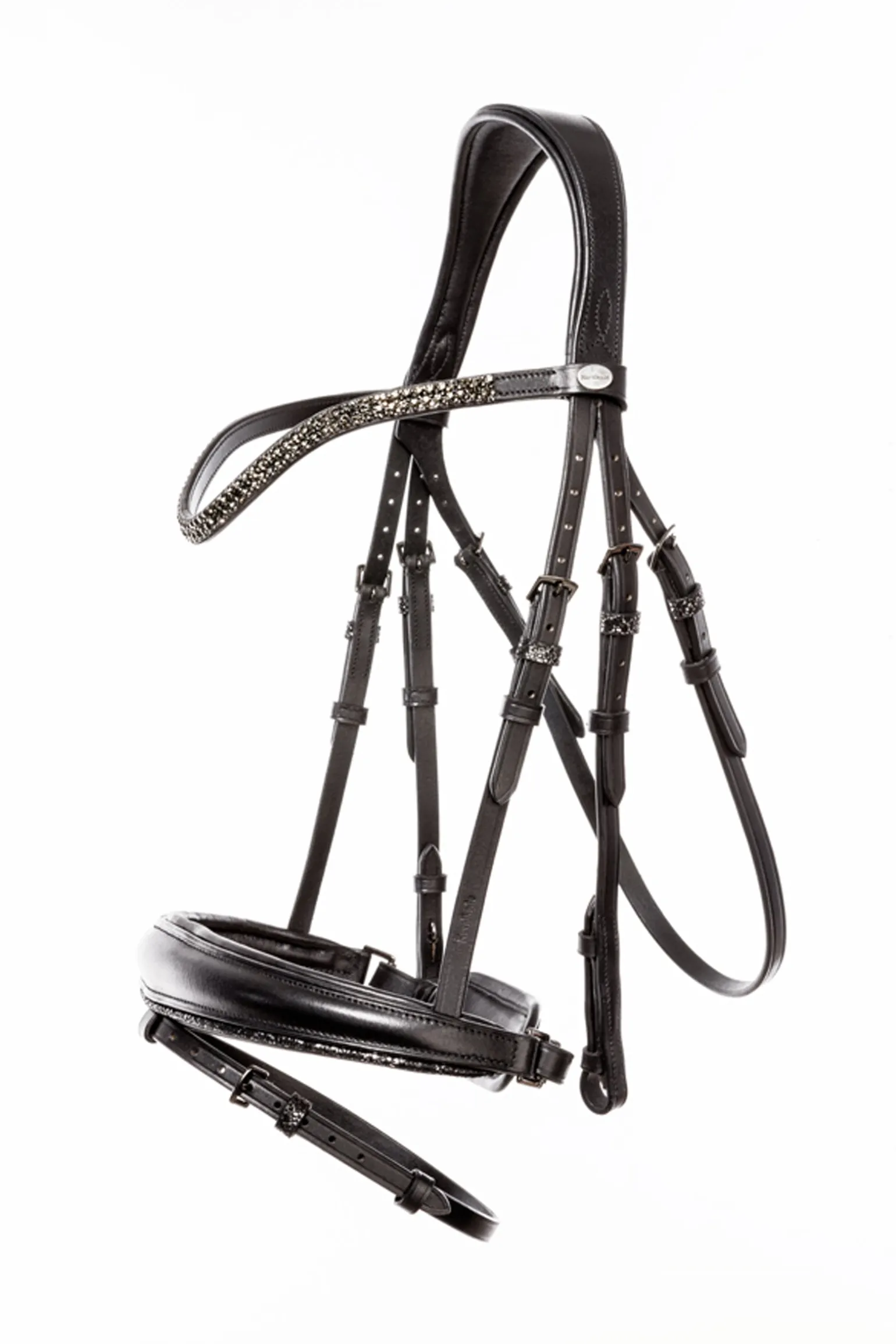 Die modische “Victoria” KavalSH4 Trense ist ein absoluter Hingucker auf deinem Pferd! Die Lederlaschen sowie der untere Rand des Nasenriemens und die Martingalstopper haben ein dekoratives Muster. Die Beschläge sind in einem passenden Dunkelgrau gehalten und das Stirnband ist mit kleinen dunklen Strasssteinen verziert. Das Genickstück ist anatomisch geformt und breit geschnitten, um mehr Bewegungsfreiheit um die Ohren zu ermöglichen. Der Nasenriemen ist weich gefüttert und verjüngt sich. Die Trense kann beidseitig verstellt werden, um eine optimale Passform zu gewährleisten.