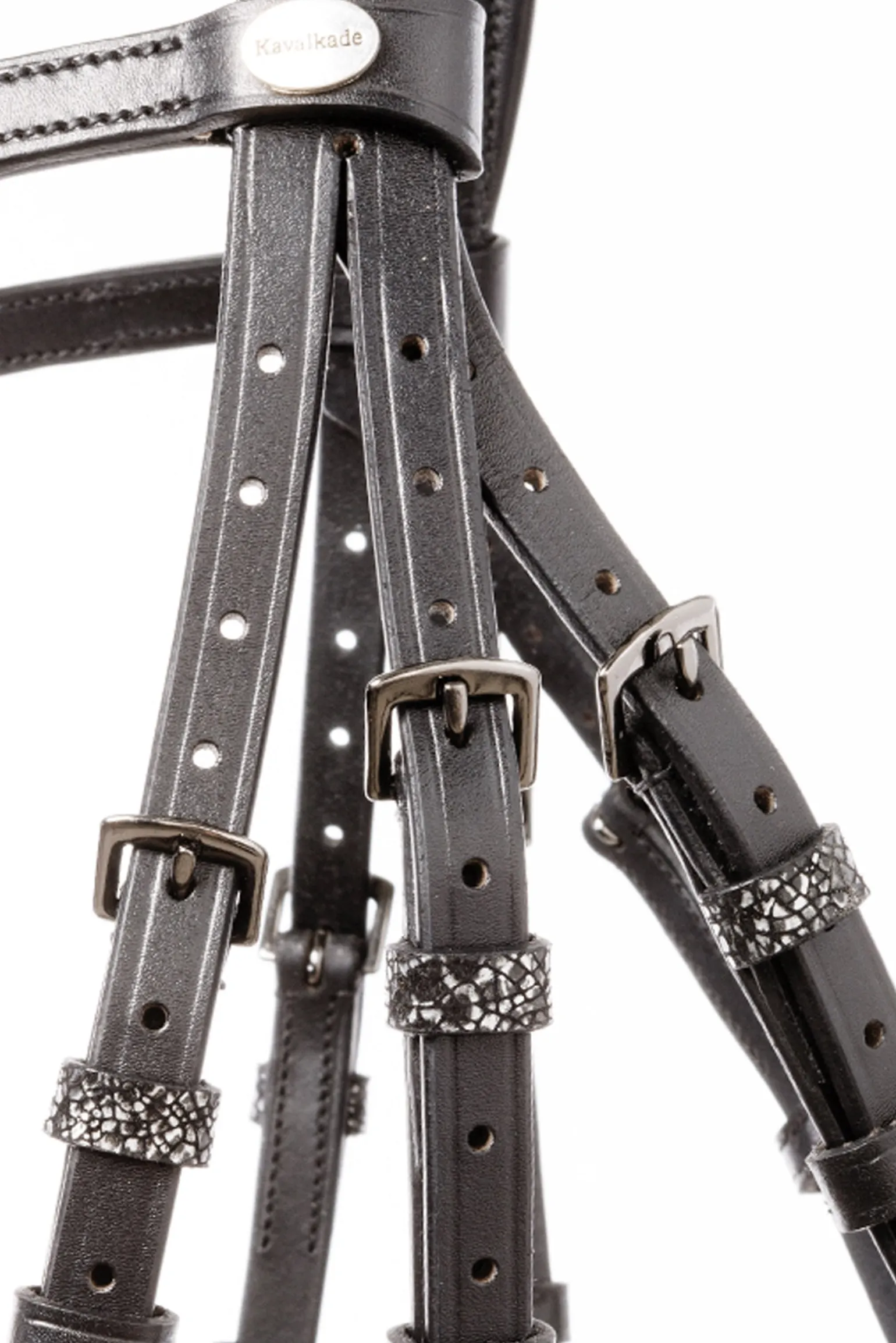 Bei Trensen mit dem Zusatz KavalSH4 ist der Sperrriemen abnehmbar. Das Besondere daran ist, dass die Befestigung für den Sperrriemen nicht sichtbar ist, wie es bei herkömmlichen Trensen mit abnehmbarem Sperrriemen der Fall ist.