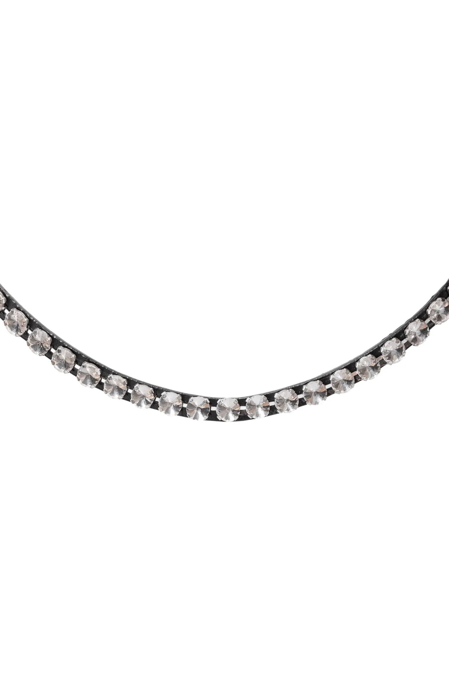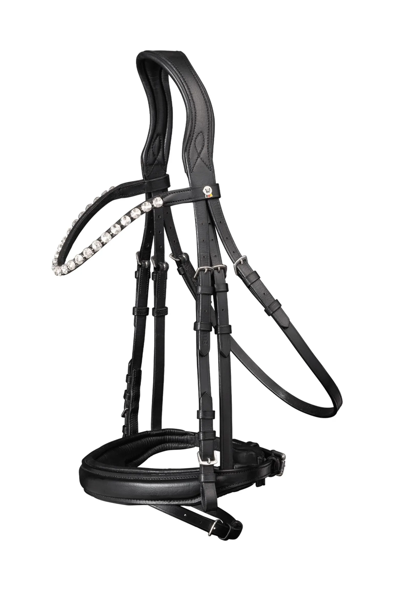 Diese Trense verfügt über einen Flash-Nasenriemen mit extra Polsterung für zusätzlichen Komfort, ein anatomisch geformtes Kopfstück sowie ein weiches Nasen- und Kopfstück. Der Flash-Strap ist abnehmbar für mehr Vielseitigkeit. Das gebogene Stirnband ist mit einer Strassstein-Kette verziert, was Eleganz hinzufügt. Kopfstück und Nasenriemen sind weich gepolstert für zusätzlichen Komfort. Edelstahlbeschläge gewährleisten Haltbarkeit und die Trense wird mit 19 mm Webbingzügeln für optimale Kontrolle geliefert.