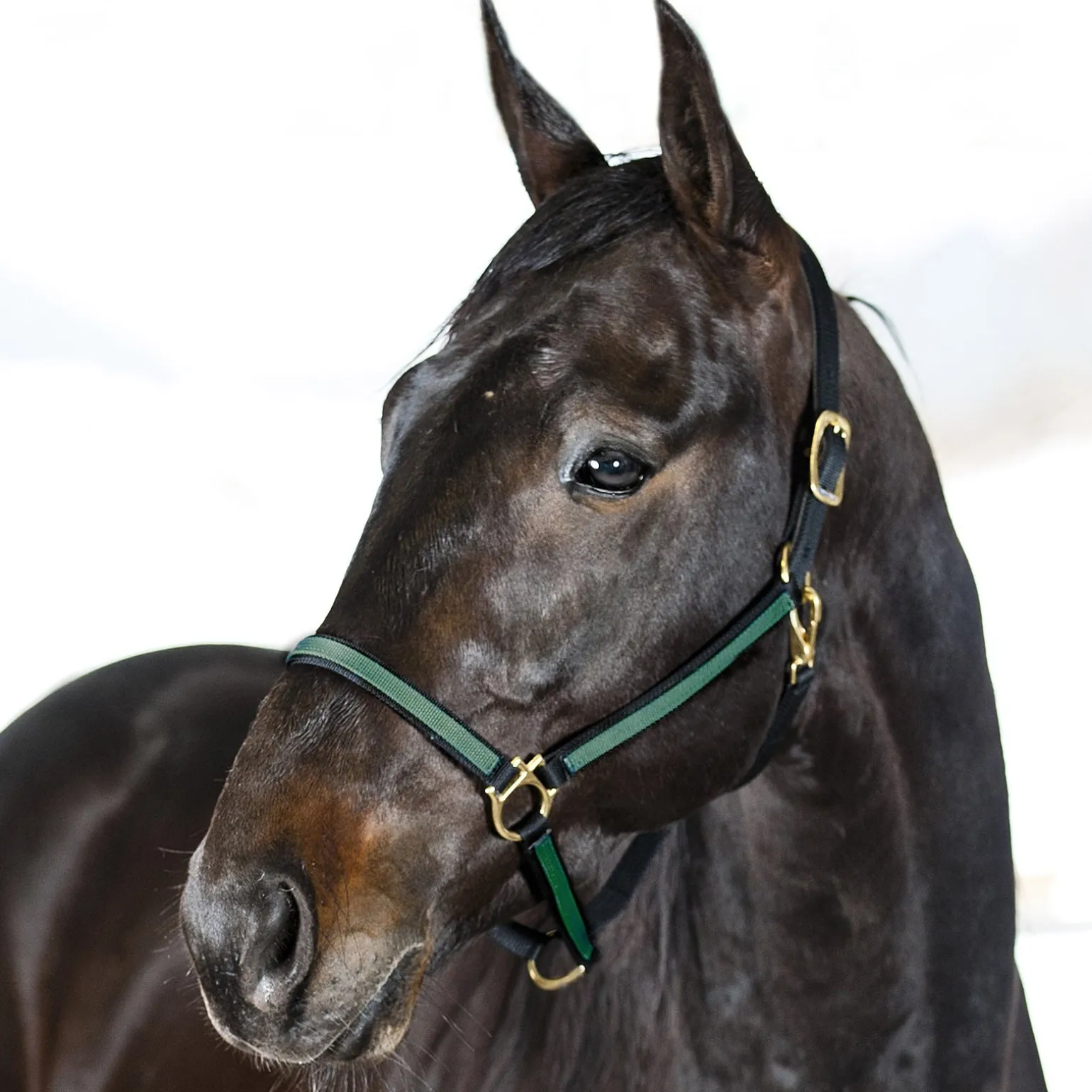 Finn-Tack Nylon Yankee Halfter, aus weich gepolstertem, 20mm starken Nylon gefertigt. Solide Messing-Beschläge und synthetisches Leder-Polster am Genick.