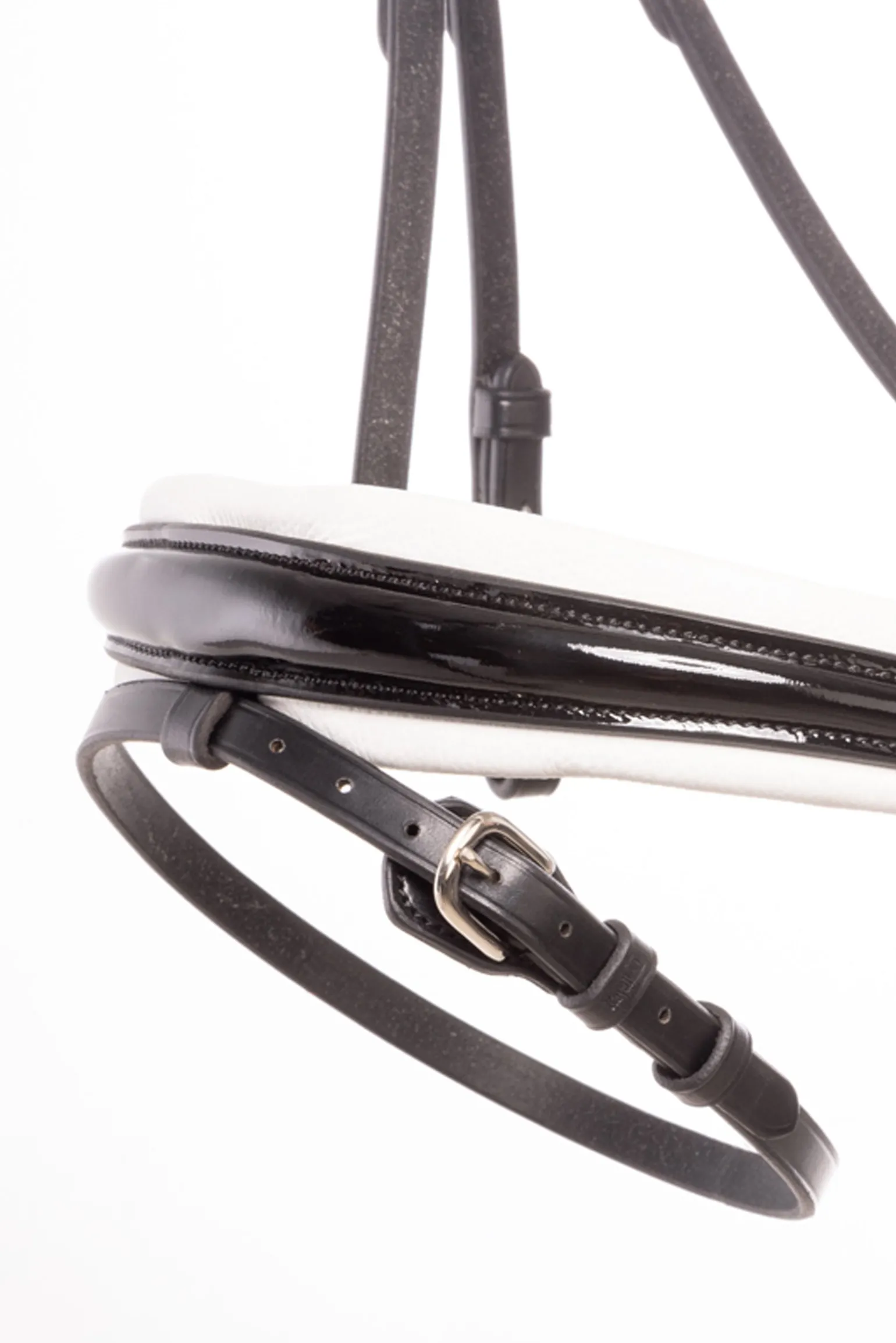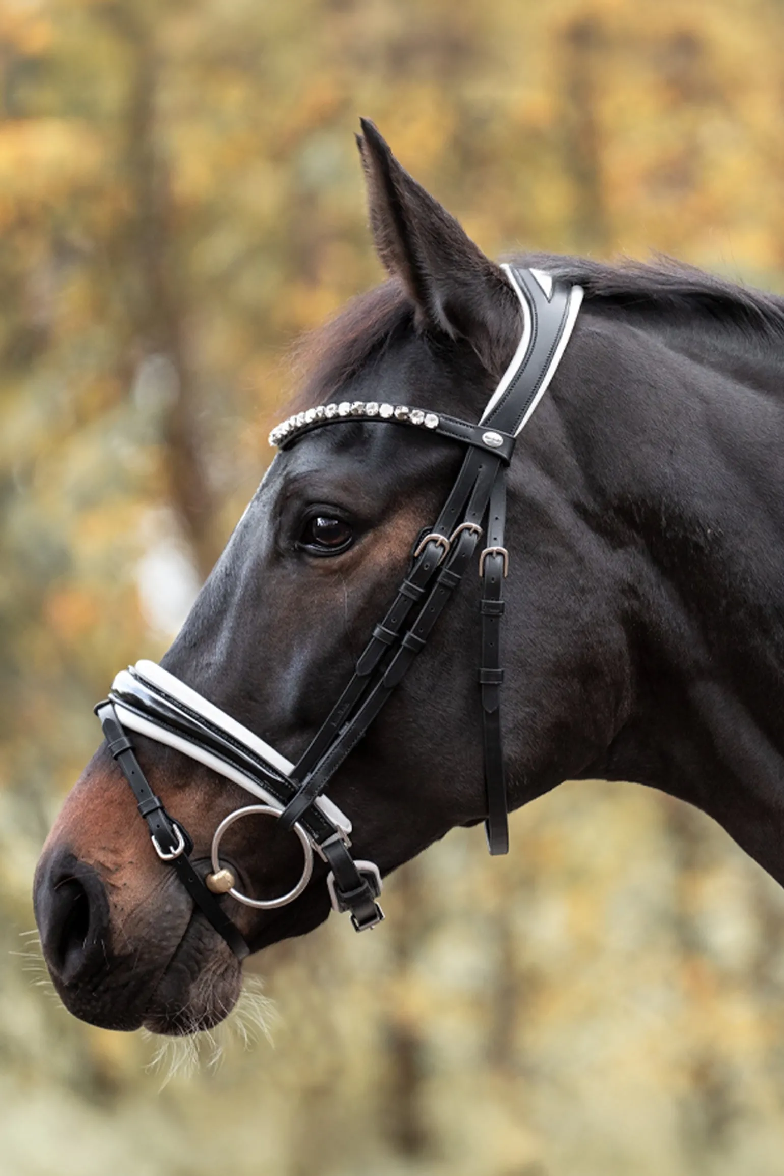 Die Dressurtrense „Zora“ besteht aus hochwertigem deutschen Qualitätsleder sowie einem besonders weichen Genickstück, welches stark anatomisch geformt ist mit Einschnitt. Die weiche Polsterung vom Nasenriemen und Stirnband bieten ebenfalls einen besonderen Komfort für das Pferd. Das Reithalfter ist beidseitig verstellbar. Der Trensenzaum wird ohne Zügel geliefert.
